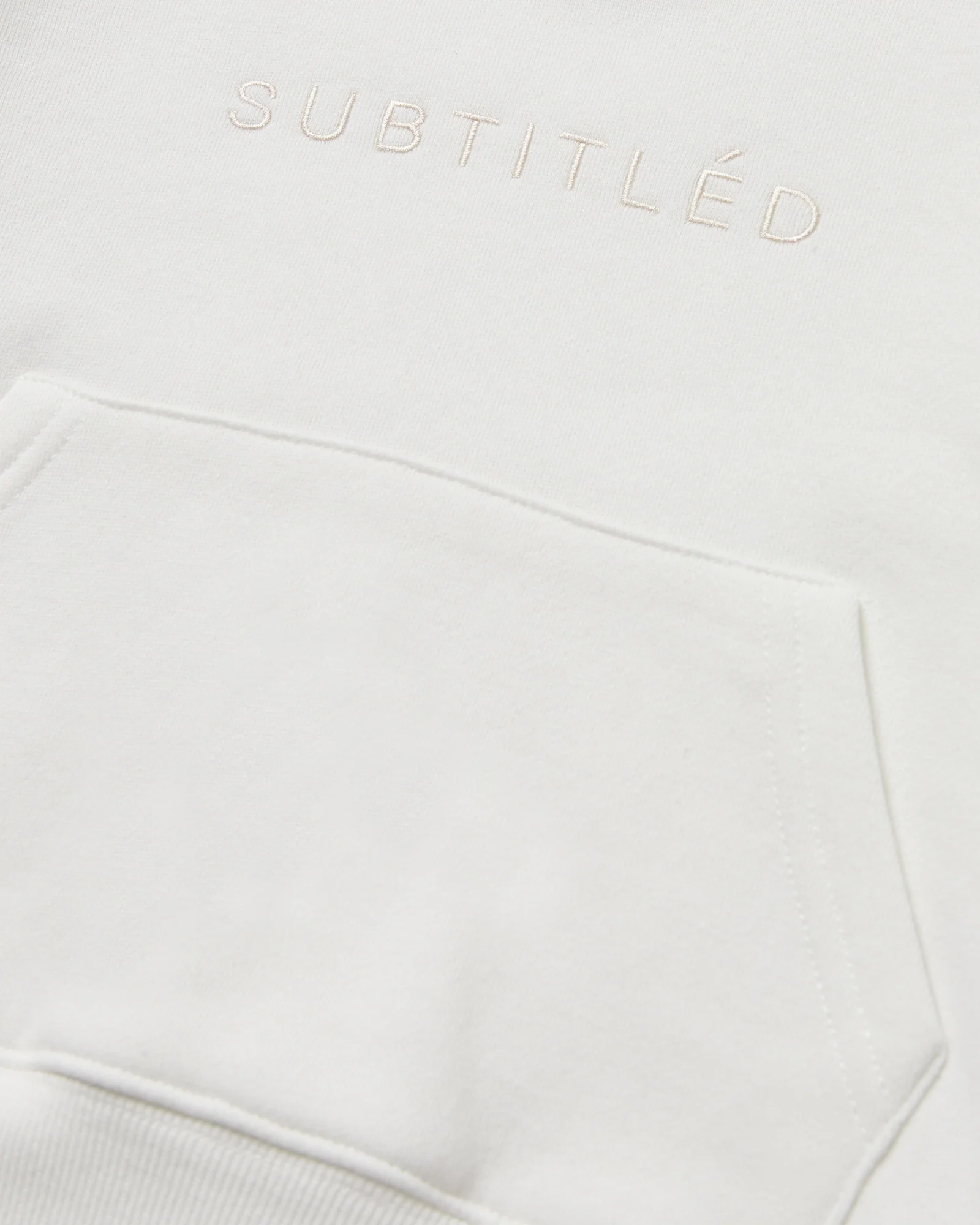 The Subtitled Girls State Oversized Hoodie in White is a fleece hoodie with a white color and signature branding on the front. It has a kangaroo pocket, ribbed cuffs and hemline, and an oversized fit.