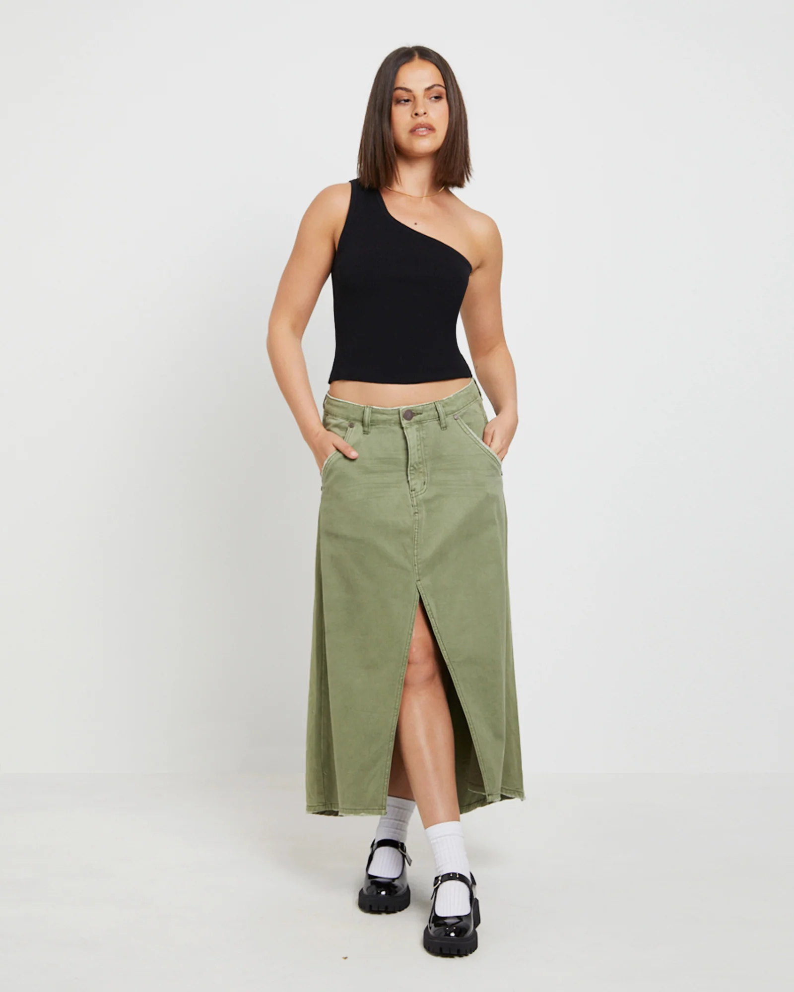 St Khaki Mrs Carter Long Denim Skirt in Green