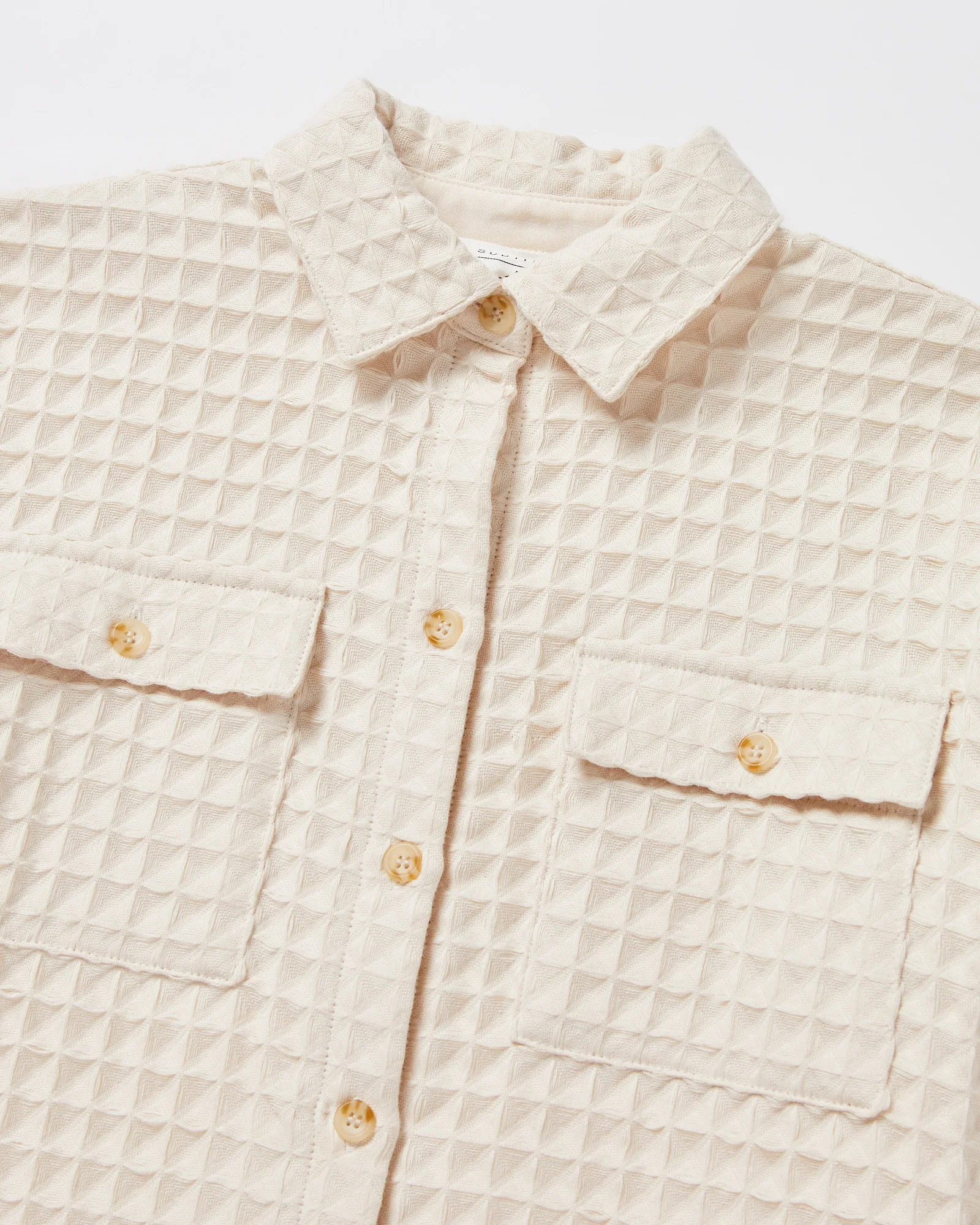 The Subtitled Teen Girls Waffle Long Sleeve Shirt in Coconut is an ivory colourway and has an oversized fit. The shirt is designed with dual buttoned chest pockets, a collared neckline, a button-up front, curved hem, and has a waffle textured fabrication.